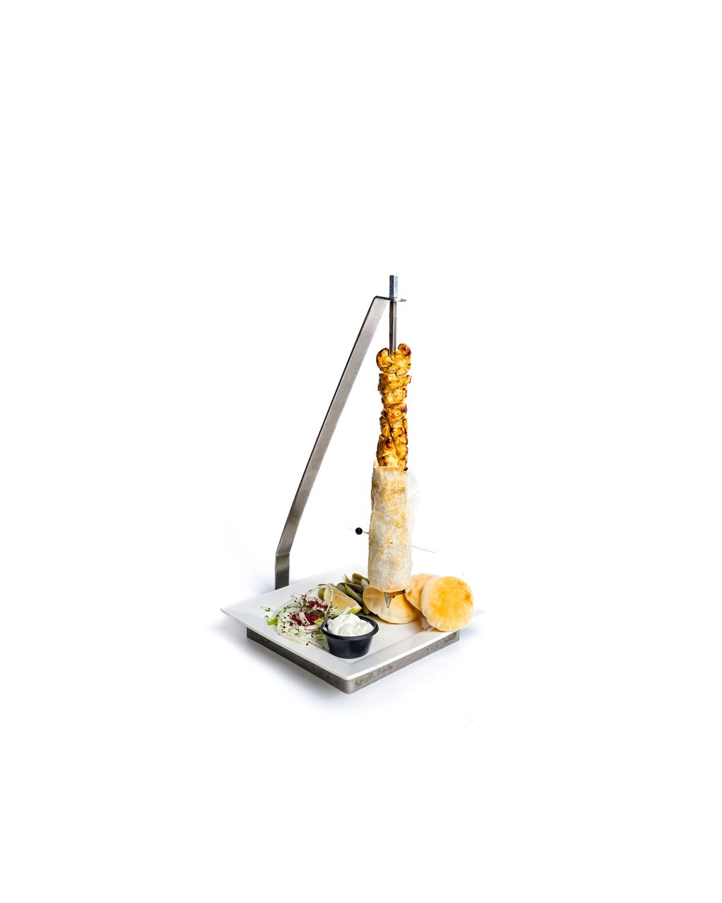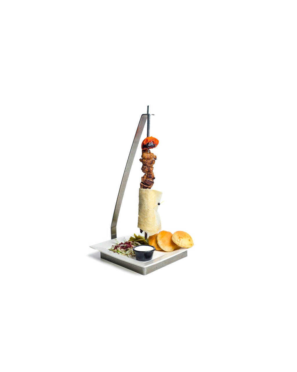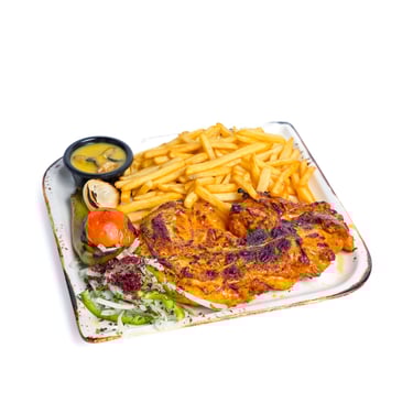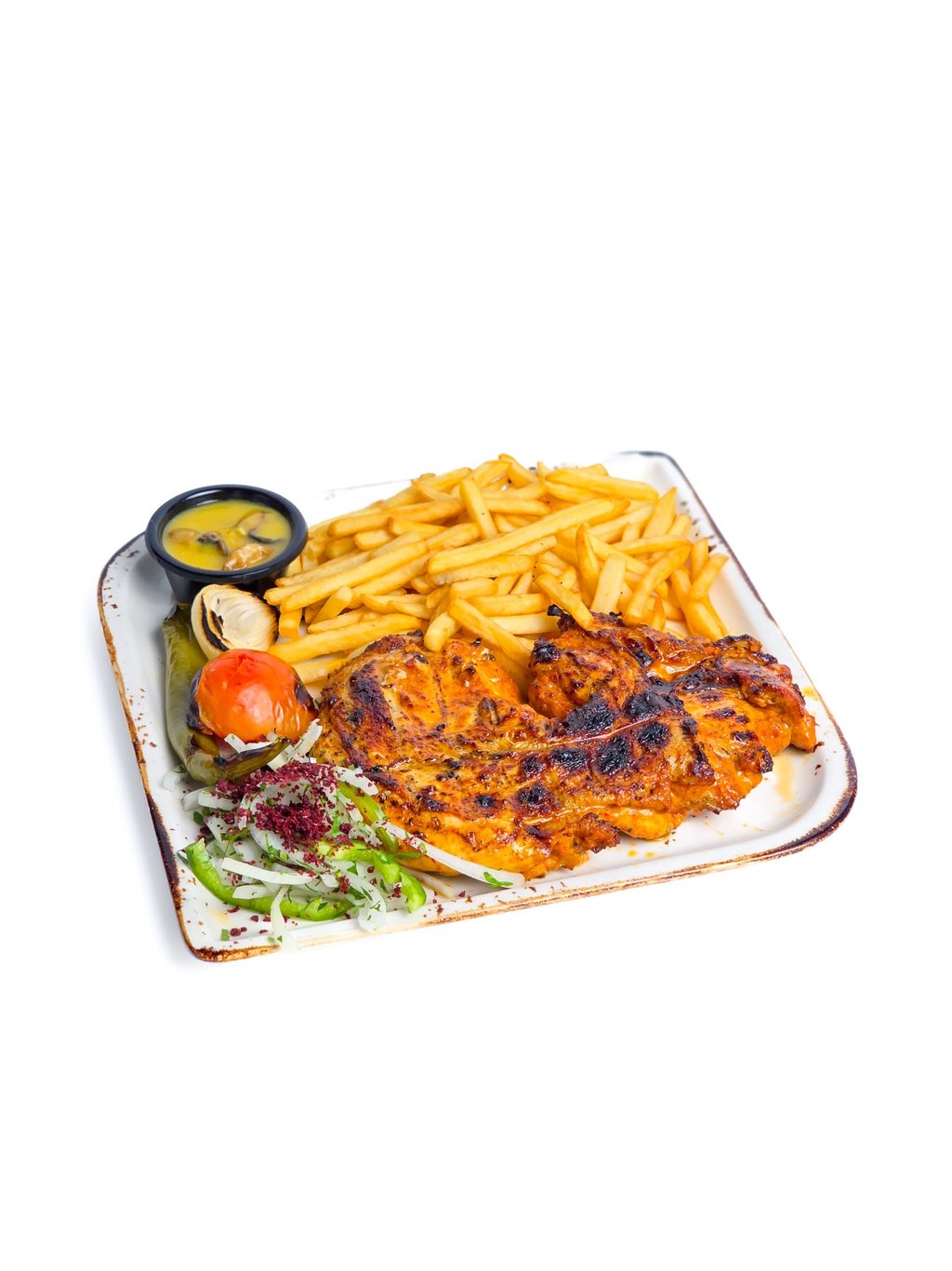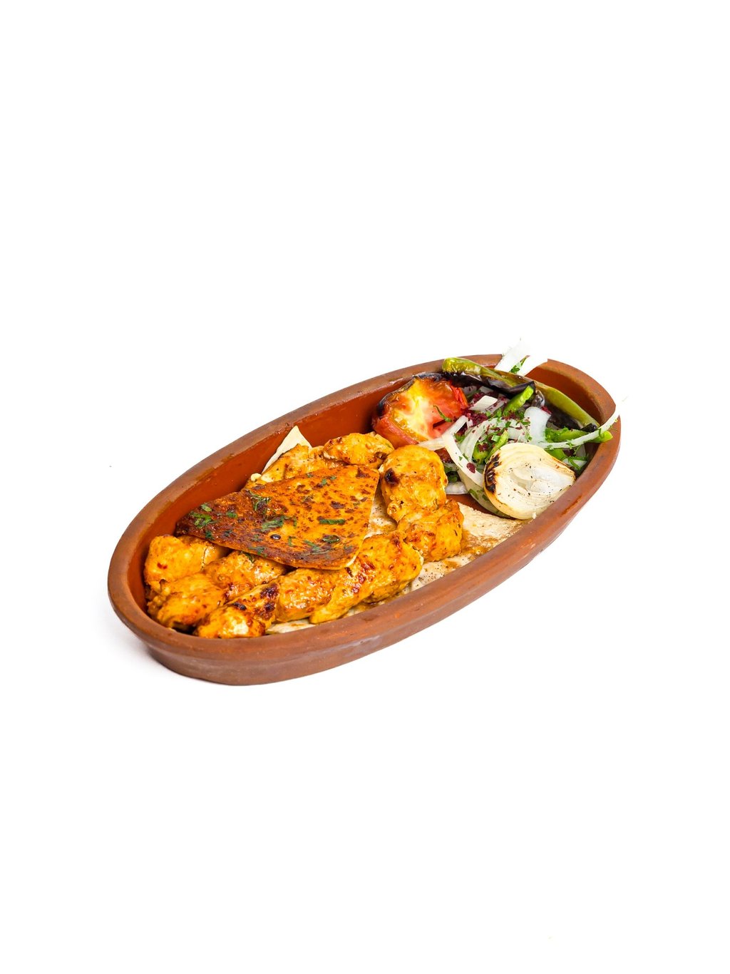 Charcoal grilled chicken sliced marinated in a special chef way served with pita bread, garlic cream and pickles.