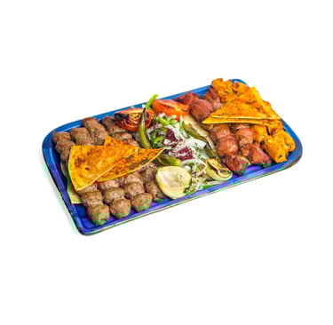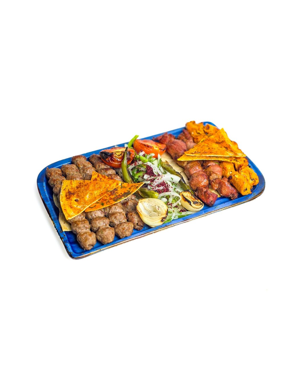 Charcoal grilled selection of kebab, shish tawook and meat cubes.