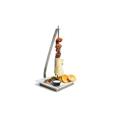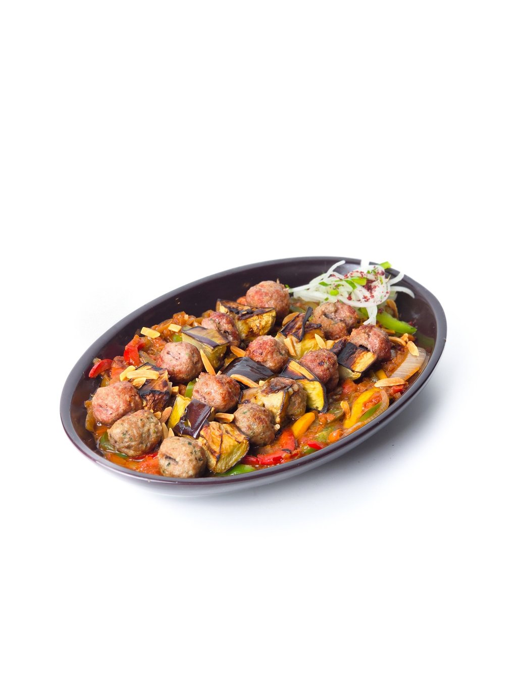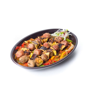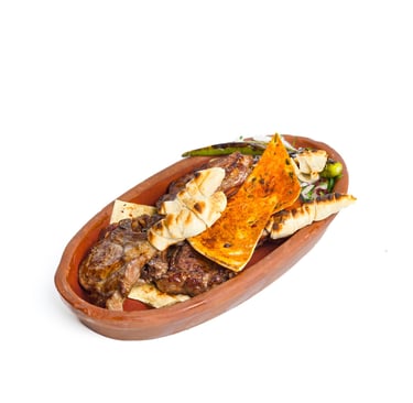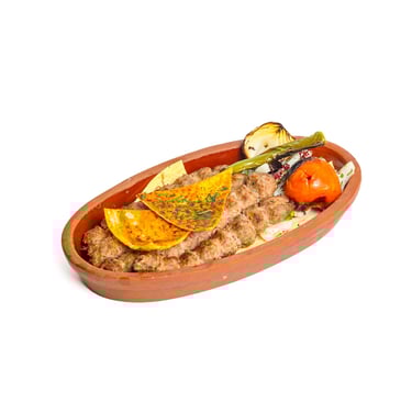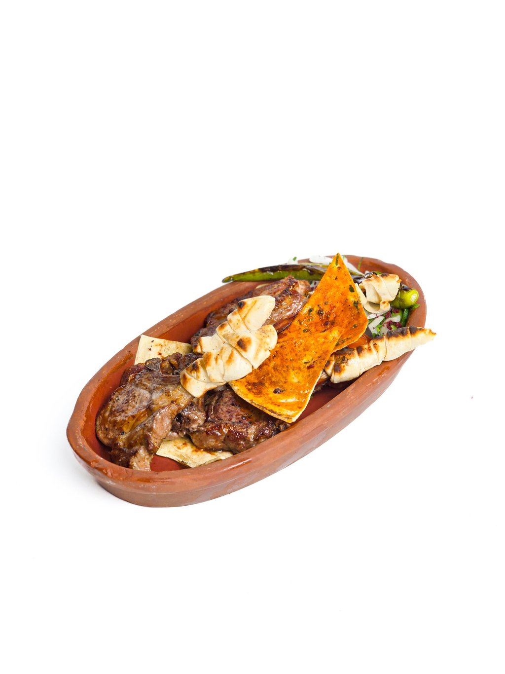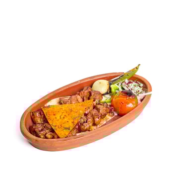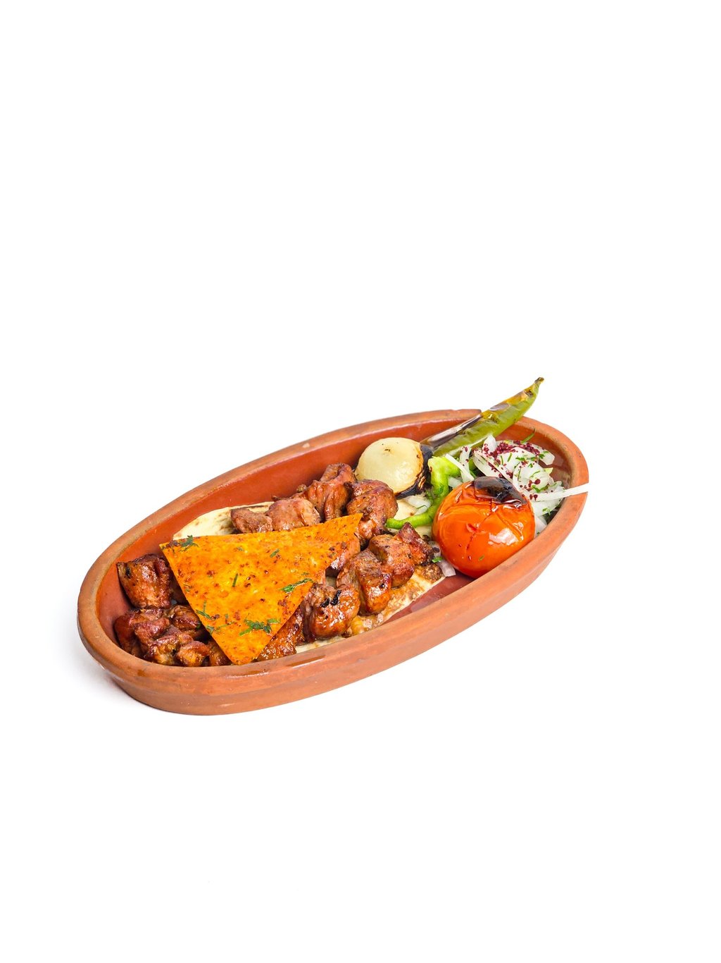 Charcoal grilled sliced meat marinated in a special chef way served with pita bread, tahini sauce and pickles.