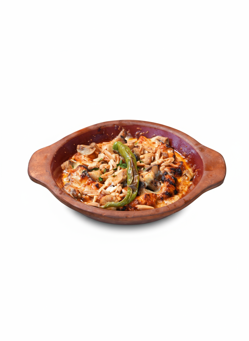 Charcoal grilled marinated chicken with mushroom sautéed topped with cheese.
