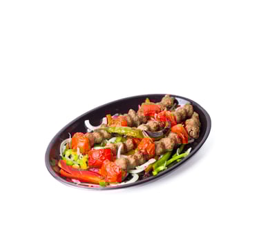Spicy kebab with grilled vegetables (tomatoes and onions).