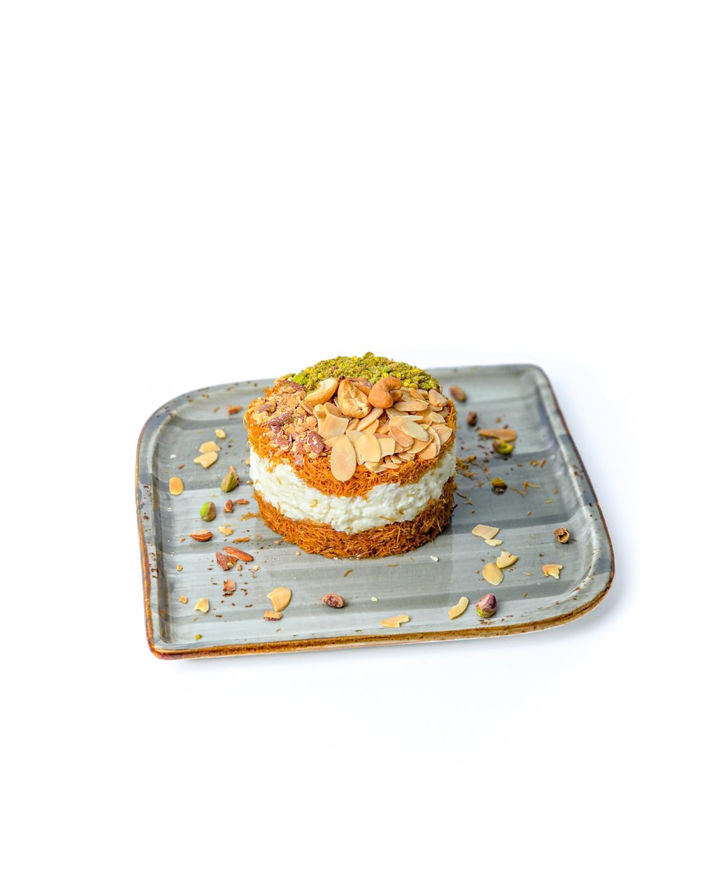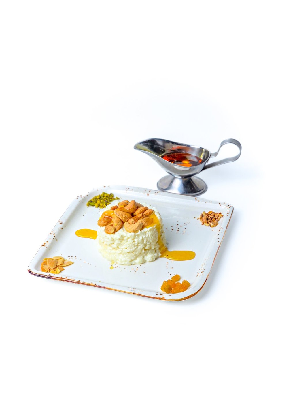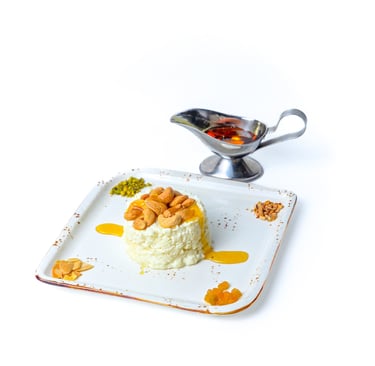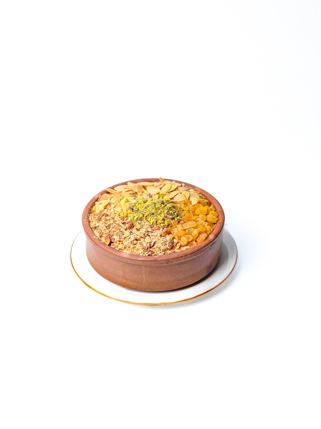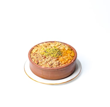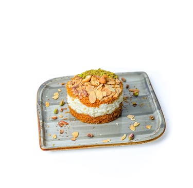 Crispy puff pastry steeped with milk topped with raisins and mixed nuts.