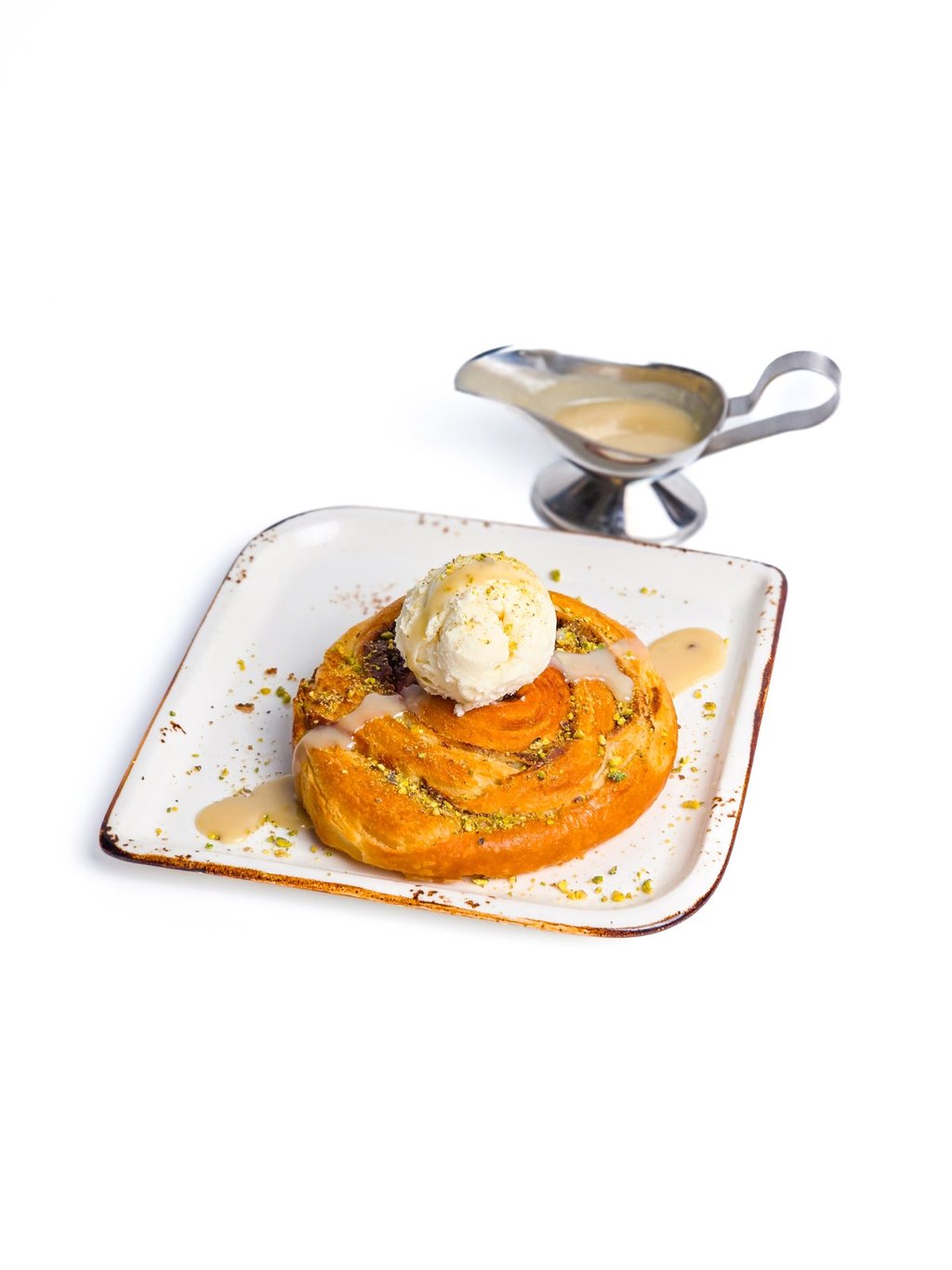 Clotted cream with ice cream, pistachios, and honey.