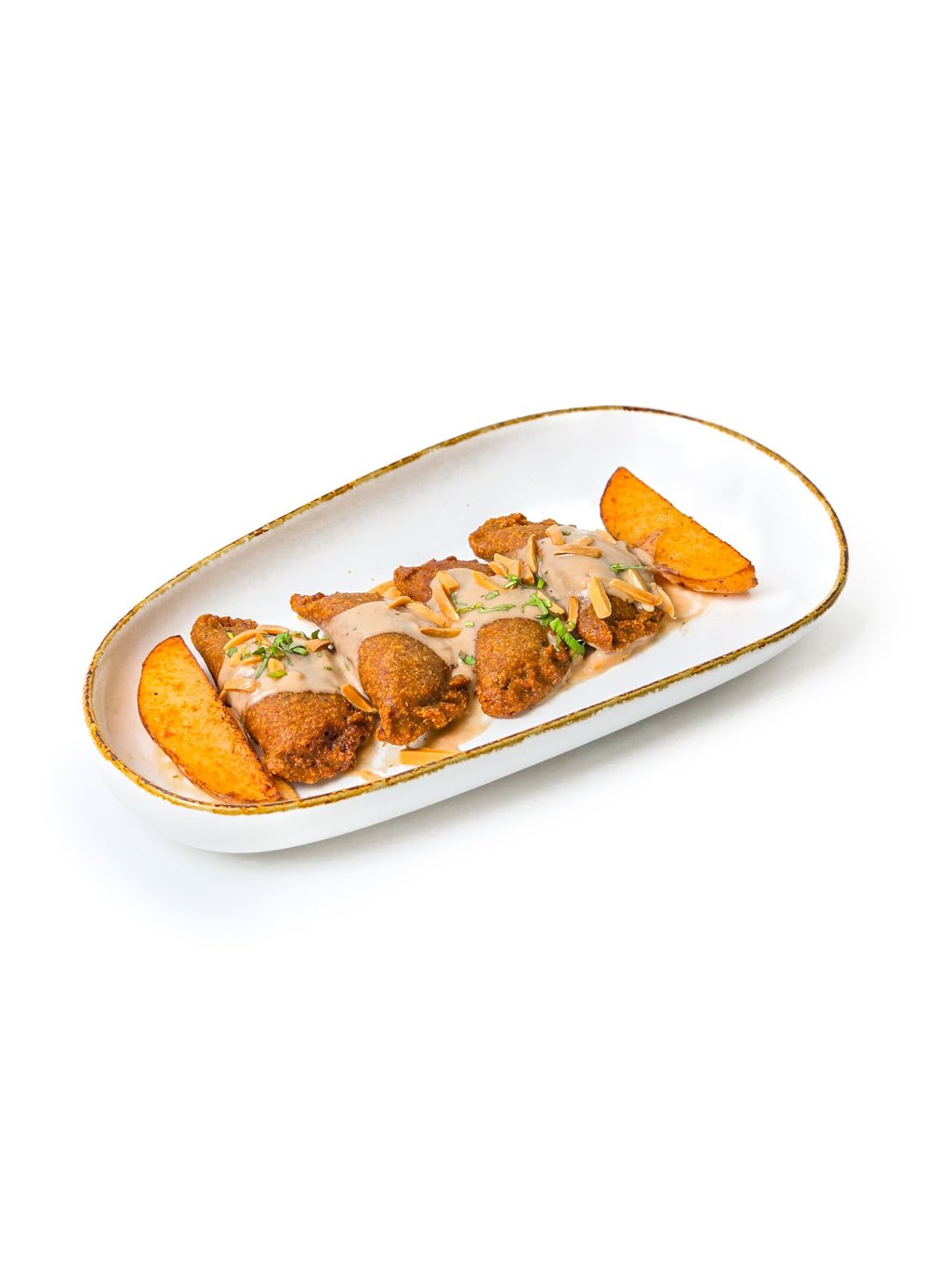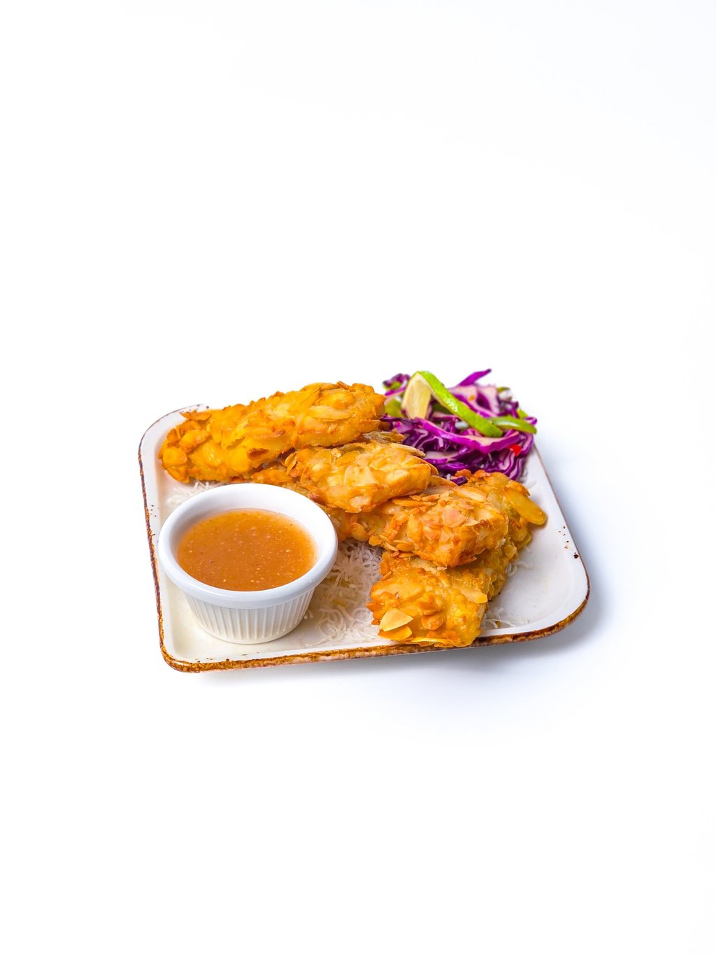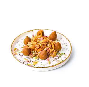 Fried kibbeh with yogurt, almonds, and crispy bread.