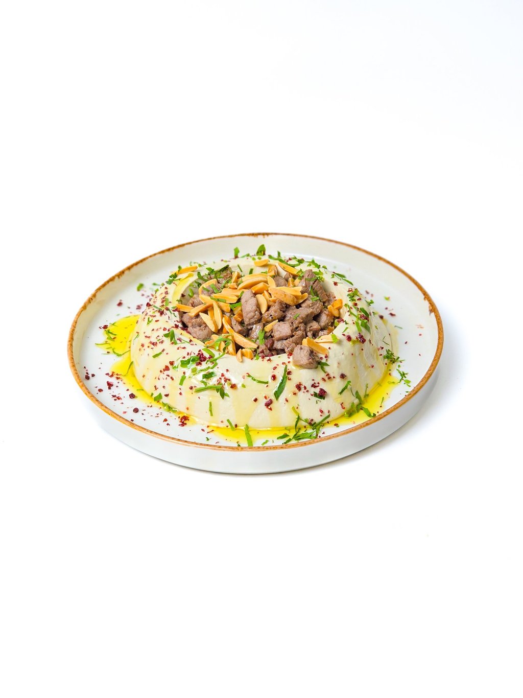 Hummus topped with sutted meat and almond.