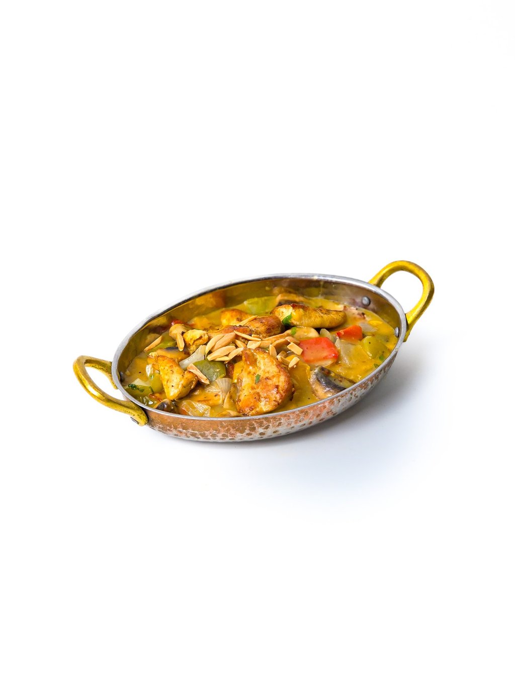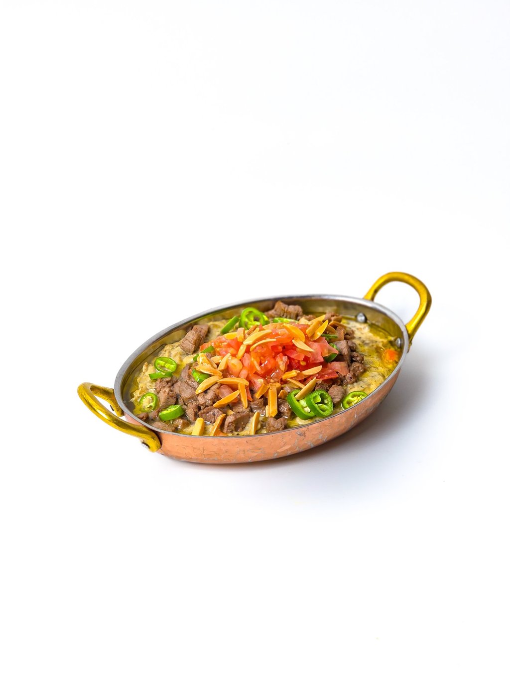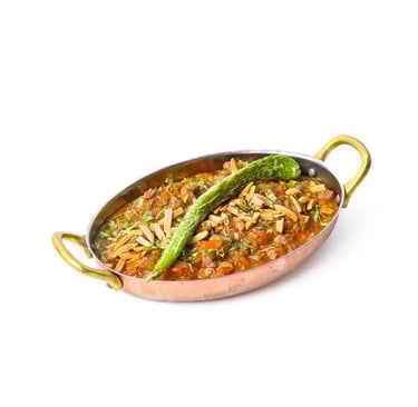 Slow cooked eggplant in a fresh cream topped with meat cubes and almonds.