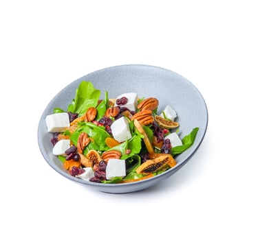 Arugula, dried apricot, pecan, strawberry, pineapple, cheese.