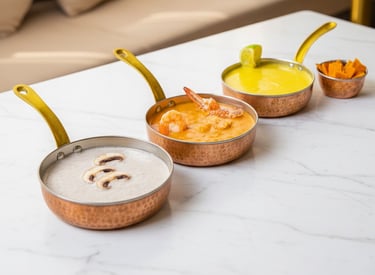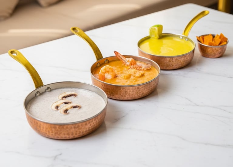 A selection of warm, flavorful soups made from fresh seasonal ingredients.