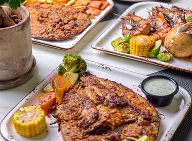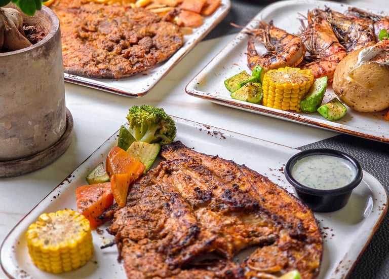 A delightful variety of fresh fish and seafood, seasoned with spices and grilled perfectly.