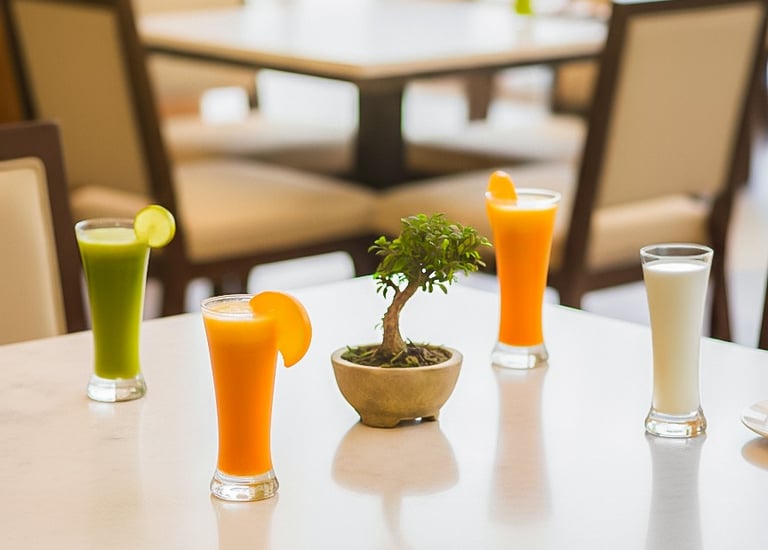 A vibrant selection of freshly squeezed juices, crafted from seasonal fruits and served chilled.