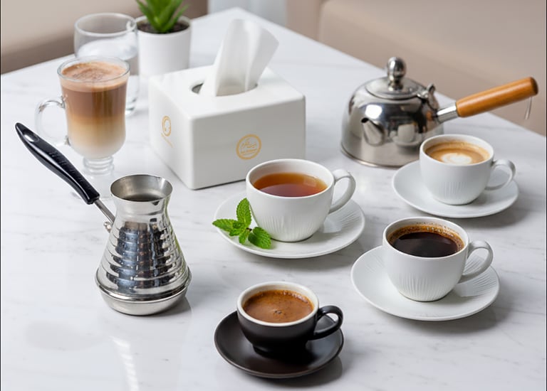 A comforting selection of freshly brewed coffees and teas, served warm with rich flavors.