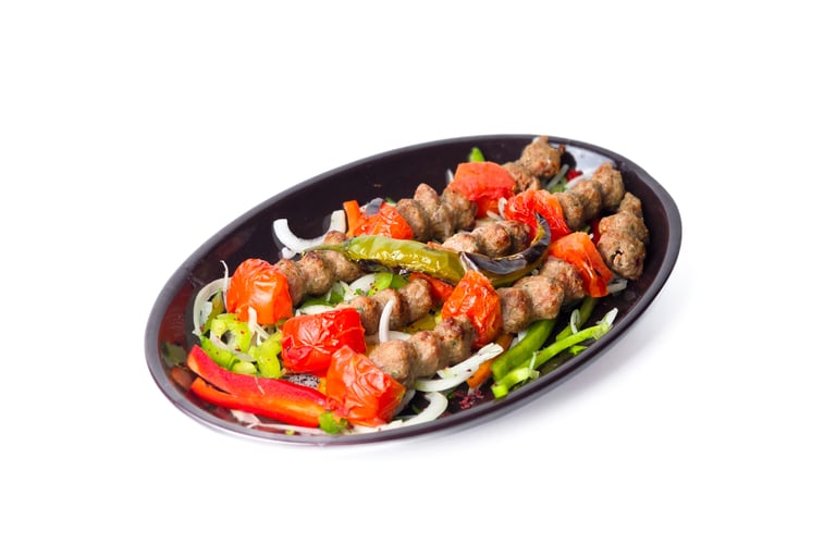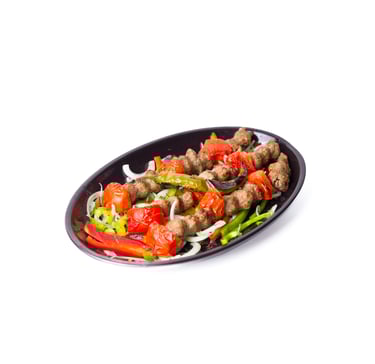Spicy kebab with grilled vegetables (tomatoes and onions).