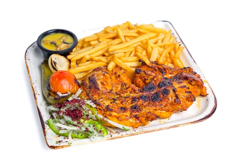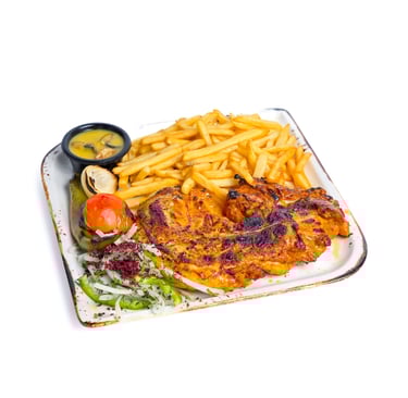 Charcoal grilled chicken sliced marinated in a special chef way served with pita bread, garlic cream and pickles.