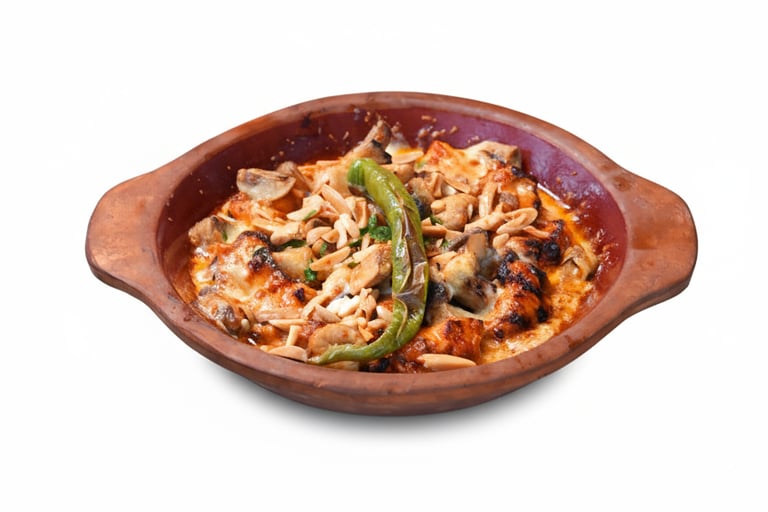 Charcoal grilled marinated chicken with mushroom sautéed topped with cheese.
