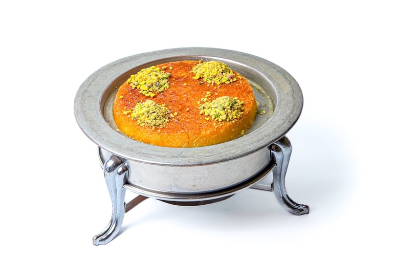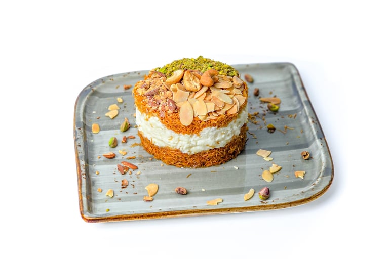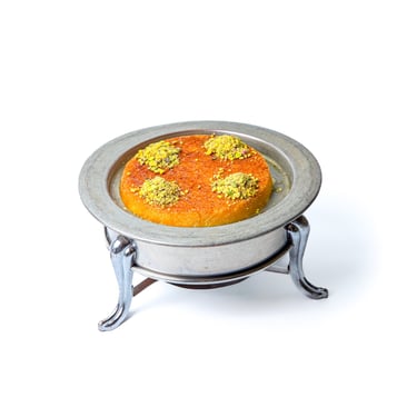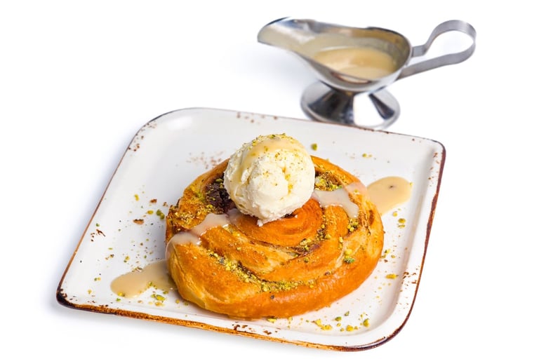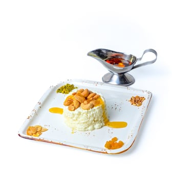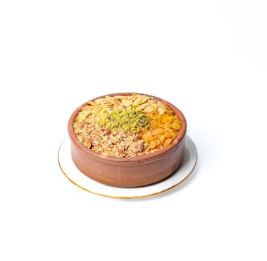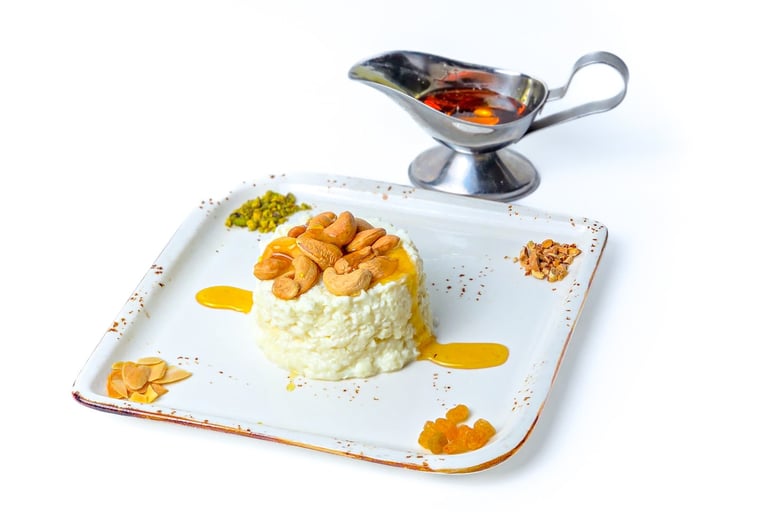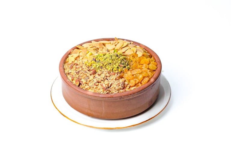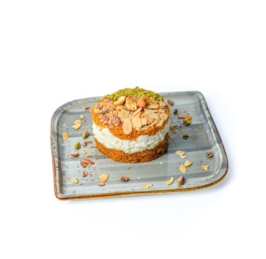 Crispy puff pastry steeped with milk topped with raisins and mixed nuts.